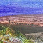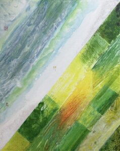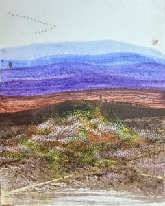 其中一件名為〈滄海桑田〉。這件作品採用了對角線構圖:一半是滄海,一半是桑田。筆者刻意讓兩者在畫面中央交匯,形成一種從高空俯瞰的視角。海浪的紋理以塑膠彩稀釋後層層疊染,營造出潮汐起落的動態;桑田則以乾筆與刮擦的手法,表現出田壟與泥土的沉穩質感。