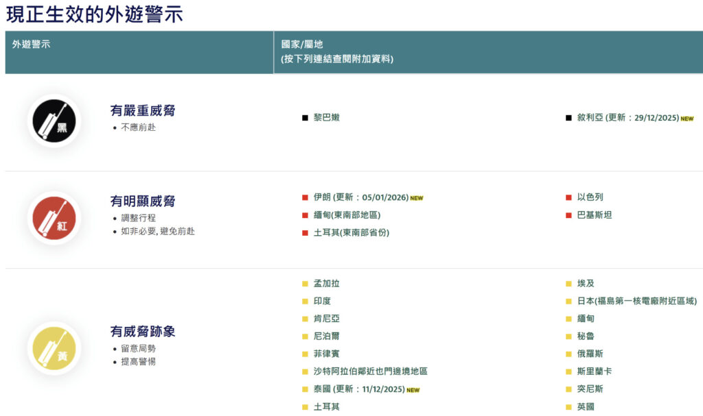 香港外遊警示(https://www.sb.gov.hk/chi/ota/ 取於2026年1月10日。伊拉克沒有任何旅遊警示)